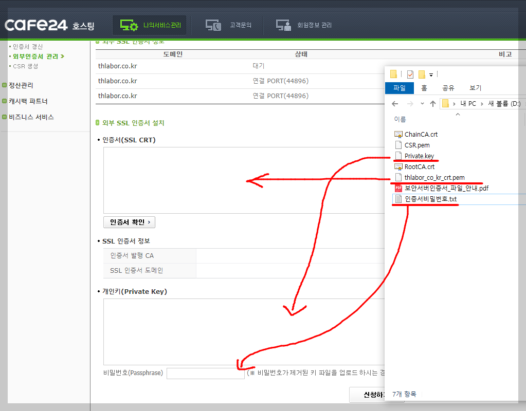 개인키 부분은 후이즈 파일중에서 Private.key 파일을 메모장으로 열고, 역시나 내용을 전체 복사해서 카페24 페이지에 삽입합니다.