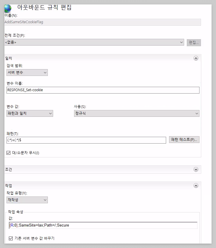 Response.AddHeader "Set-Cookie", 쿠키명=쿠키값;Domain=도메인명;Expires="& formattedDate &";SameSite:lax;Secure;"